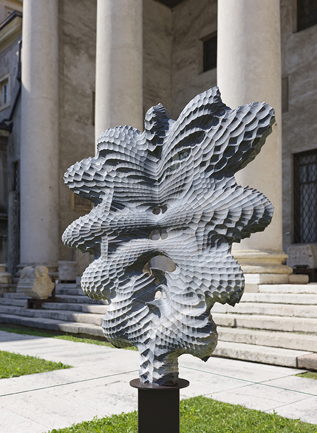La dialettica tra ordine e perturbazione attraversa anche le coppie Axialis (I, II) e Symmetric (II, III). Le prime giocano sulla corrispondenza tra l’asse centrale della scultura e quello del cortile, trasformando buchi, curvature e ondulazioni in una sorta di grammatica strutturale che dialoga con l’architettura circostante. Le seconde forzano la simmetria fino a un punto limite: Symmetric II come un nodo gordiano levigato, Symmetric III come una replica quasi “barbara” nella sua esattezza insistita, una classicità imitata fino allo spasimo, come nota Cariolato.