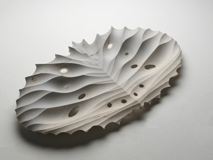 There are also works that explore stone as a spatial threshold. Transizione VII opens like an incised fan, and what strikes the viewer is the thinness of the epidermis of its mineral blades — almost impossible to believe unless seen up close. Pristis plays on the idea of the point, of the arrow, transformed instead into a dynamic curve that suggests the bending of spacetime. Calice is a material vortex: furrows, wrinkles, zones of density that render “magmatic” the perfect form of the circle hollowed within it.